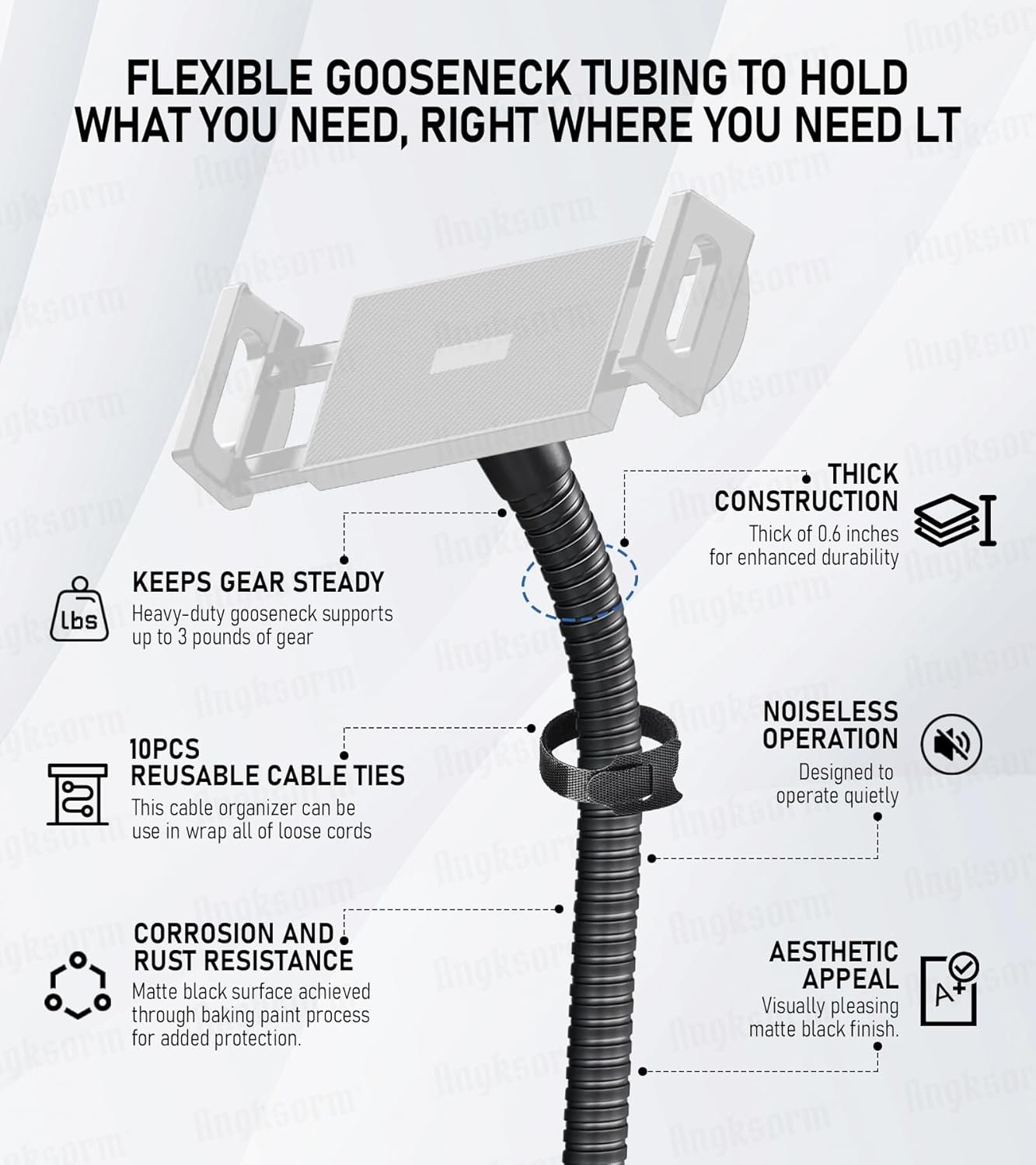 Constructed with a high-grade metal core wrapped in a protective coating, this flexible gooseneck phone holder easily bends to your desired angle and holds its shape securely. Say goodbye to shaky shots and limited positions—this sturdy gooseneck keeps your devices right where you want them.