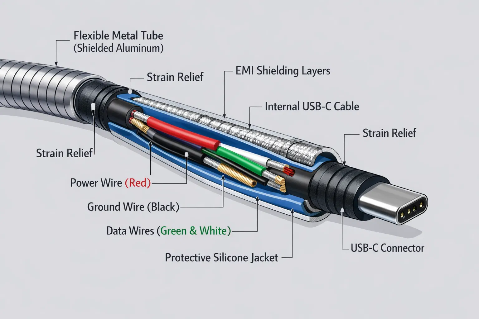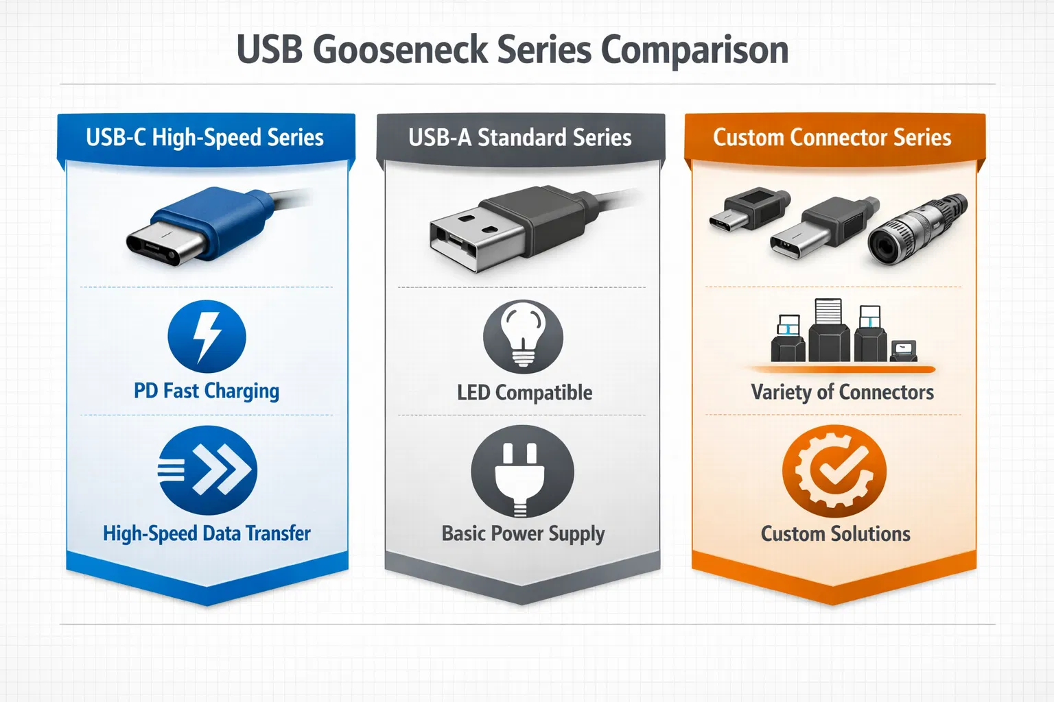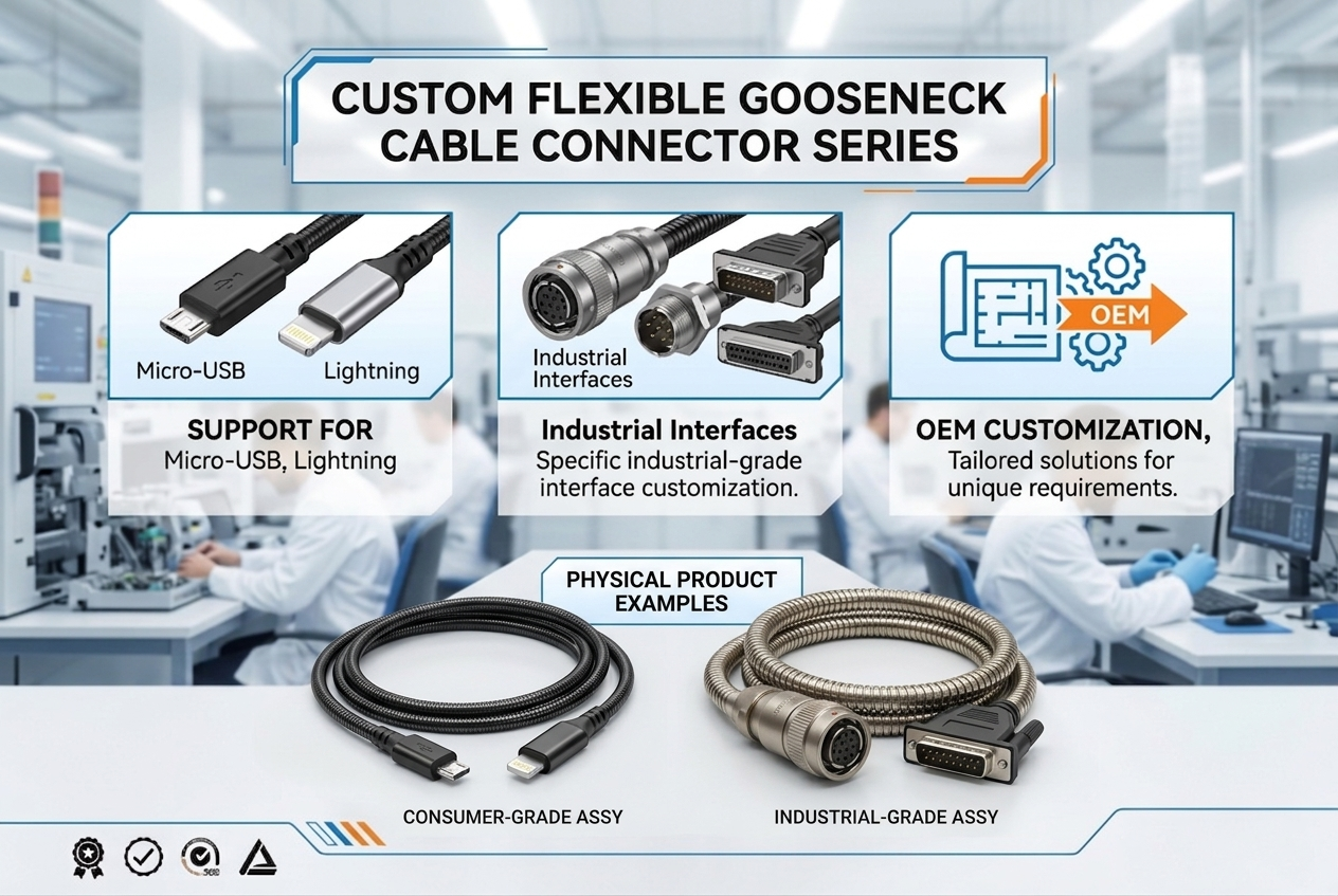 Longer cables experience higher voltage drop due to increased resistance. A 2-meter gooseneck at 3A will drop approximately 0.15V, while a 0.5-meter version drops only 0.04V. We provide detailed voltage drop calculations for each custom length. For critical applications, we recommend shorter lengths or higher wire gauge (20AWG).